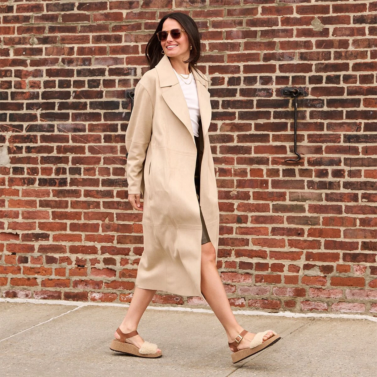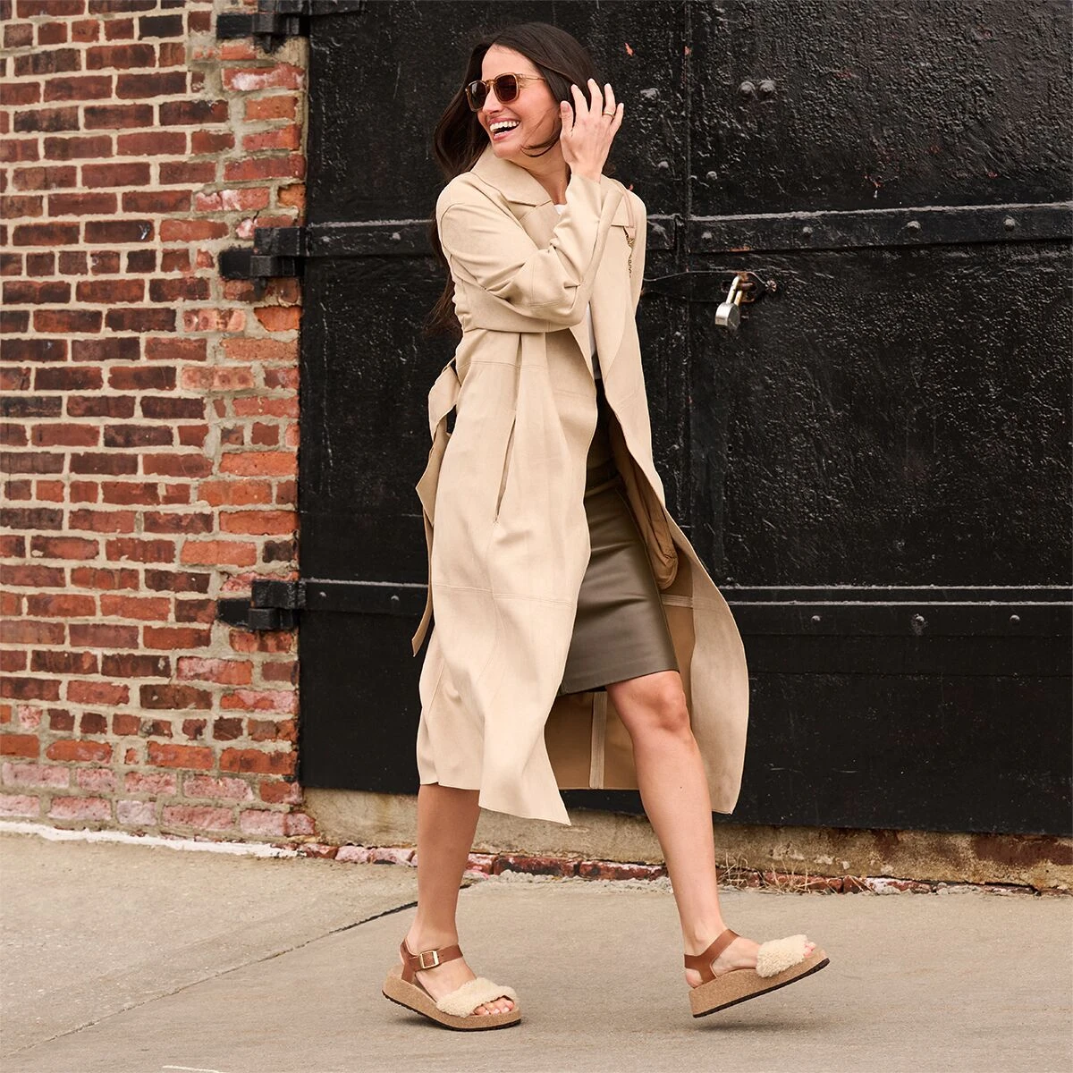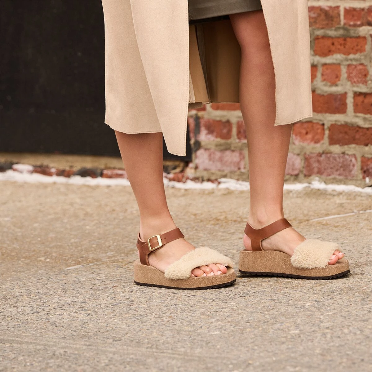 The Glenda Teddy Narrow Sandal takes our casual sandal game a step further by featuring a soft, fuzzy shearling fur over the toe strap. We see it as combining our favorite cozy slipper with a striking everyday sandal.