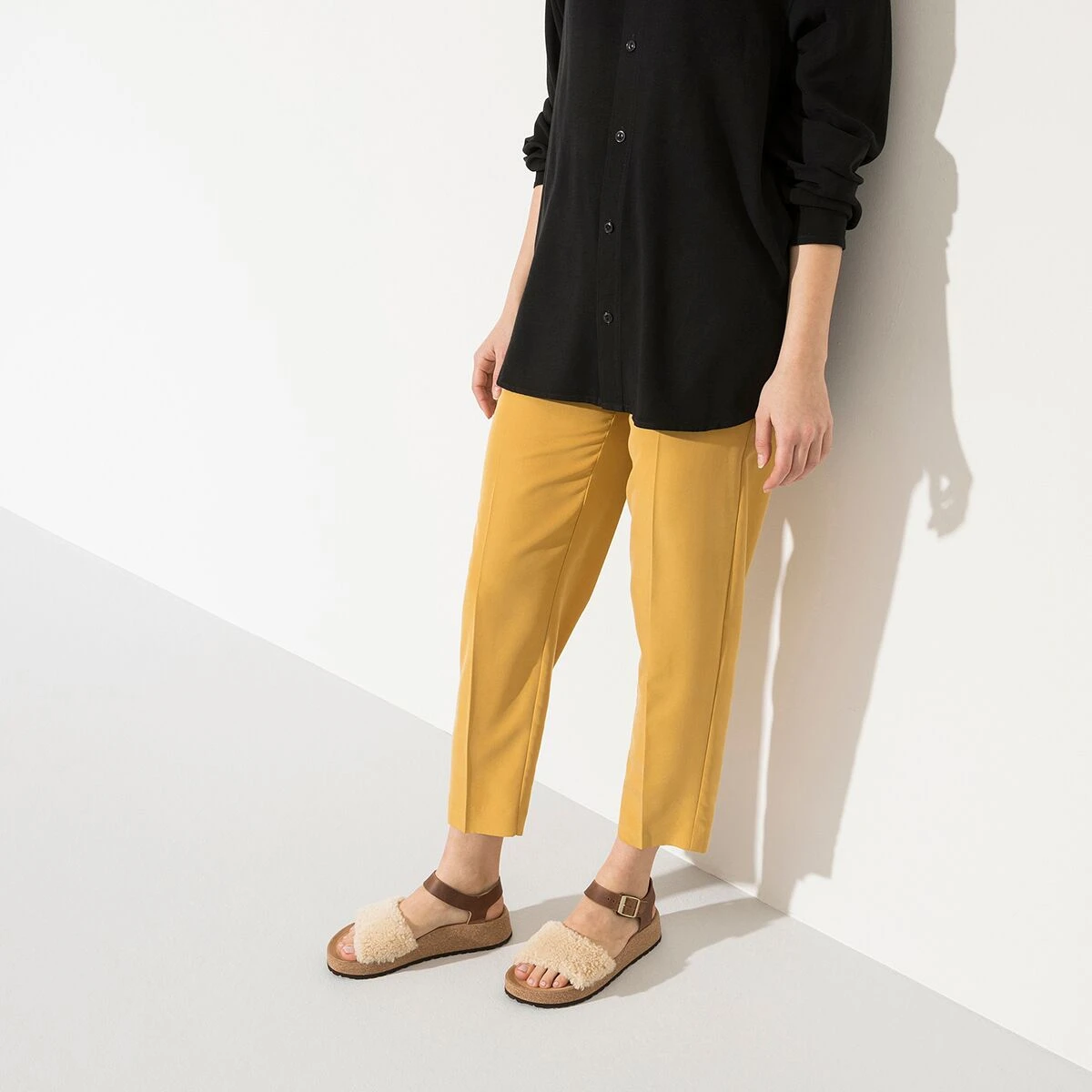 - Shearling fur across toe strap softens your look