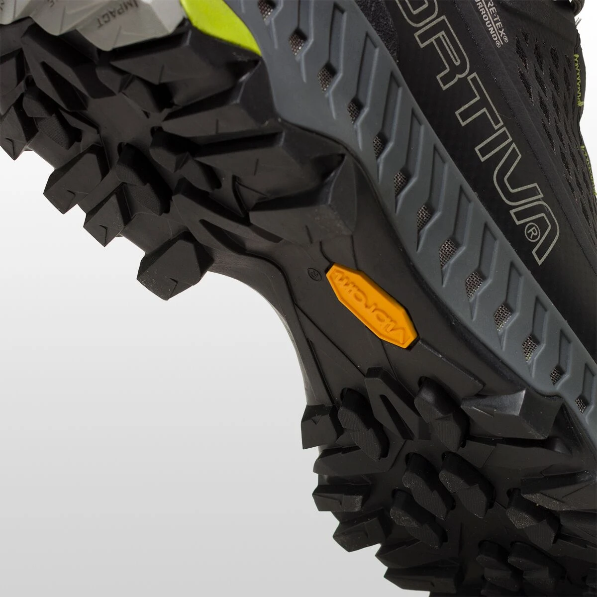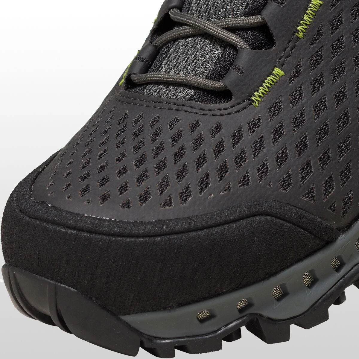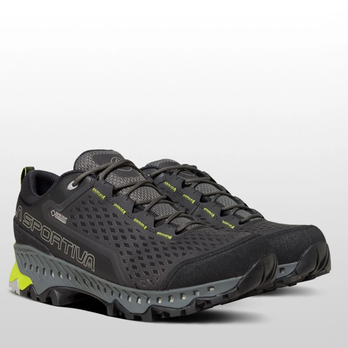 The La Sportiva Spire GTX Hiking Shoe offers the performance, durability, and protection we need for rugged peak-bagging day hikes and fast-moving backpacking trips. This versatile hiking shoe features Gore-Tex Surround technology, which not only offers waterproof protection in the lining and upper, but delivers effective draining for multi-dimensional dryness on the trail. One of the only pitfalls of a waterproof shoe is that although waterproof membranes keep water out, they also keep water in when creek crossings and other mishaps leave them soaking wet from the inside. The Spire GTX solves this problem by incorporating aeration channels within the footbed and midsole, as well as drainage ports towards the bottom of the shoe, giving a fully waterproof construction that continues to keep our feet dry when the unexpected happens.